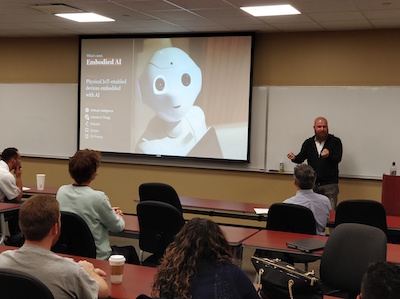 Scott Likens, 1996 Lewis University Computer Science alumnus and New Services and Emerging Technology Leader at PwC, came to campus on October 24, 2018, to give a talk entitled "The New Tech Future is Here: How 8 Technologies Will Revolutionize What's Next". Scott helps create and foster a vision for PwC to create and use innovative technology for their clients' work around the globe. Having advanced the use of technologies such as robotics, artificial intelligence, drones, and blockchain in projects in the United States, China, and Japan, Scott shared his perspectives on the growing impact of data science and machine learning on how we live, work, and play. Several students and faculty attended the presentation and asked excellent questions about Scott's takes on where the next new breakthroughs will occur. After the presentation, Scott met with CaMS faculty and deans to discuss how we could better prepare students for today's and tomorrow's innovations. Scott is a generous supporter of the University, having funded a large portion of Lewis's first high-performance compute node in honor of his dad, Thomas Likens. We thank Scott for his generosity and the time he took to share his expertise and vision with us.